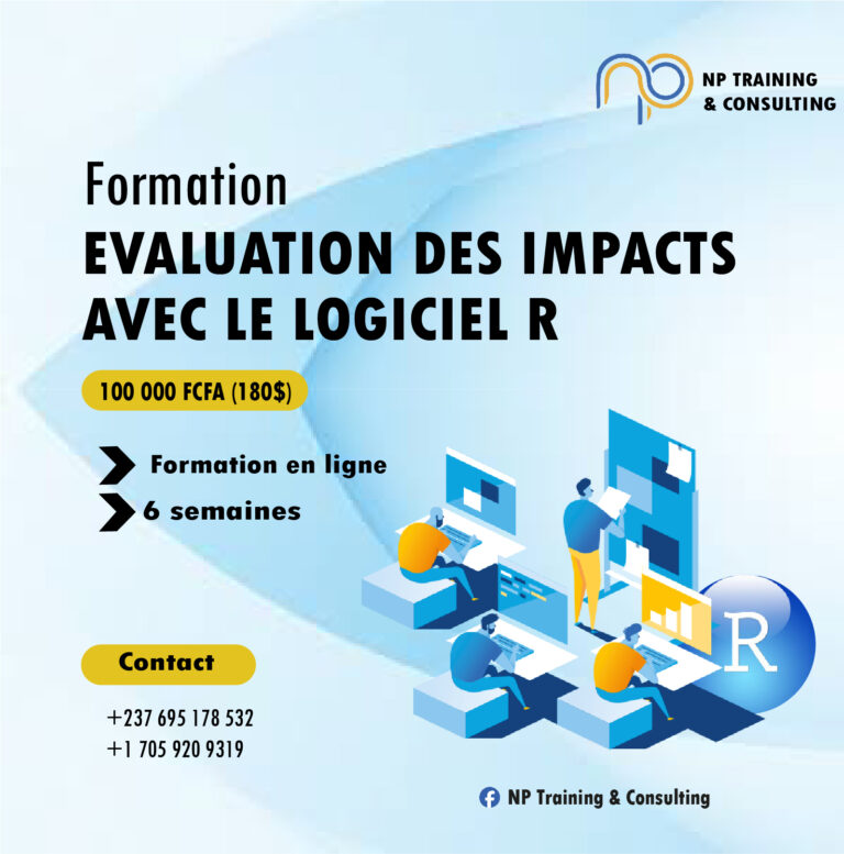 La formation d’évaluation des impacts avec le logiciel R est une formation conçue pour renforcer les capacités en évaluation d’impact, en combinant rigueur méthodologique et outils analytiques modernes avec R. La formation spécialisée est destinée aux professionnels souhaitant mesurer l’impact réel des projets, programmes et interventions, à  l’aide de méthodes quantitatives avec R. Elle couvre :